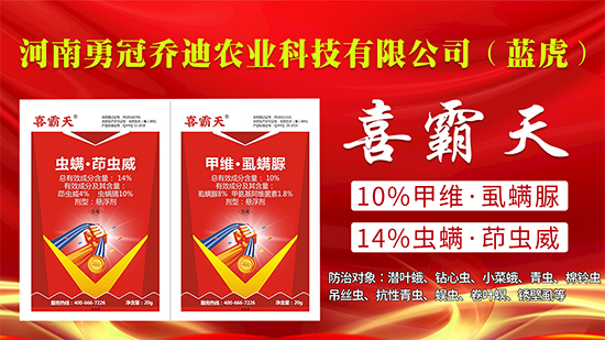 河南勇冠喬迪農(nóng)業(yè)科技有限公司(藍(lán)虎)【10%甲維·虱螨脲+14%蟲螨·茚蟲威-喜霸天】本品由兩種具有不同作用機(jī)制的殺蟲有效成分混配而成,適于害蟲綜合治理及抗性管理;具有胃毒、觸殺作用,且具有一定的殺卵作用,滲透性強(qiáng),殺蟲速度快,持效期長,耐雨水沖刷。