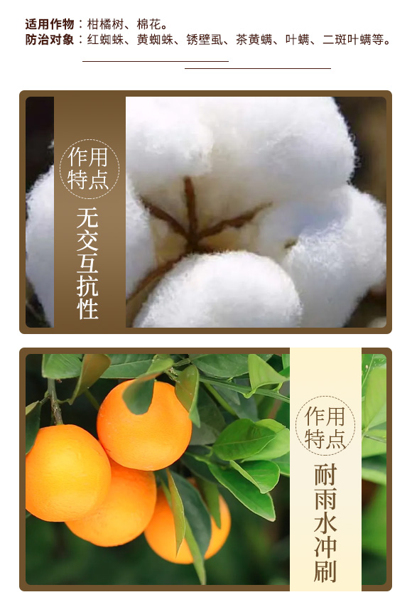 防治對(duì)象∶紅蜘蛛、黃蜘蛛、銹壁虱、茶黃螨、葉螨、二斑葉螨等。