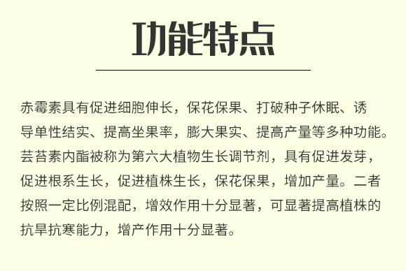 赤霉素具有促進(jìn)細(xì)胞伸長,;ū9、打破種子休眠、誘導(dǎo)單性結(jié)實、提高坐果率,膨大果實、提高產(chǎn)量等多種功能。蕓苔素內(nèi)酯被稱為第六大植物生長調(diào)節(jié)劑,具有促進(jìn)發(fā)芽,促進(jìn)根系生長,促進(jìn)植株生長,保花保果,增加產(chǎn)量。二者按照一定比例混配,增效作用十分顯著,可顯著提高植株的抗旱抗寒能力,增產(chǎn)作用十分顯著。