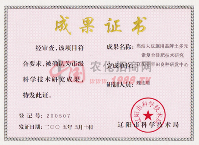 證書名稱:成果證書 發(fā)證機構:遼陽市科學技術局