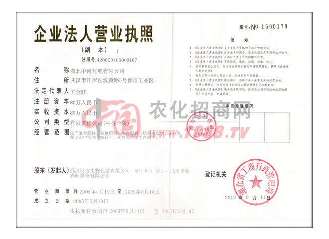 湖北中南化肥有限公司成立于2005年12月。中南化肥有限公司由美國S.K.X等中美兩國高科技企業(yè)合資興建,由武漢市批準(zhǔn)、湖北省工商行政管理局注冊登記的外資企業(yè)。中南化肥公司吸收了包括美國農(nóng)業(yè)博士、國內(nèi)農(nóng)業(yè)大學(xué)和科研單位的農(nóng)業(yè)教授、研究員和高級農(nóng)藝師在內(nèi)的一大批國際化肥方面的高級技術(shù)人才。中南(國際)化肥有限公司為中國化工學(xué)會化肥專業(yè)委員會團(tuán)體會員,華中農(nóng)業(yè)大學(xué)教學(xué)實習(xí)和科研成果轉(zhuǎn)化基地。