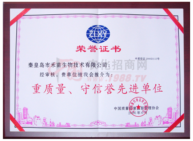 2006年禾苗公司被評為“重質量、守信譽先進單位”;