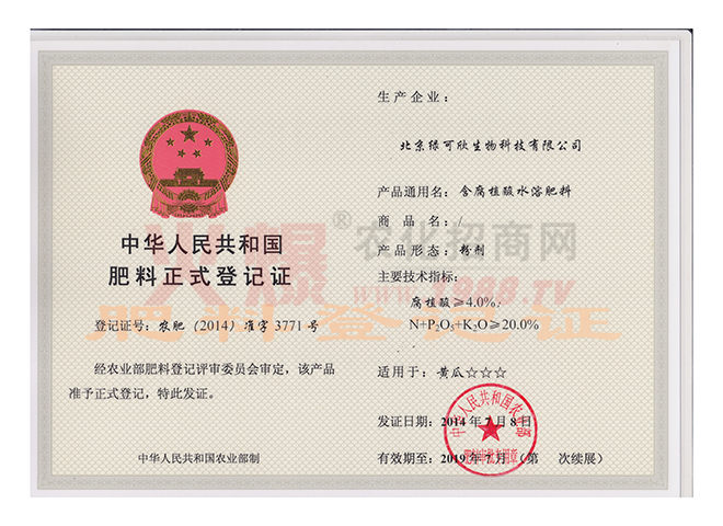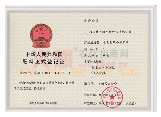 北京綠可欣生物科技有限公司成立于2007年,我們的核心技術(shù)是將進(jìn)口的高純醫(yī)藥級(jí)海藻精原粉,與氨基酸、黃腐酸、和大、中、微量元素螯合在一起,使產(chǎn)品不但可以“激發(fā)作物的生命潛能”,“提高作物的抗逆性”,“增加作物的產(chǎn)量”,同時(shí)可以限度的平衡“營(yíng)養(yǎng)生長(zhǎng)”和“生殖生長(zhǎng)”,在國(guó)內(nèi)尚屬首創(chuàng)。