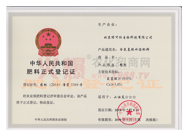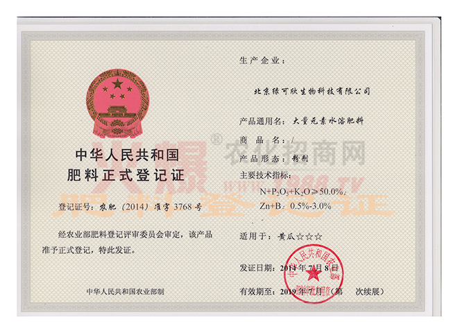 農(nóng)業(yè)部頒發(fā)的正式肥料登記證5個(gè)