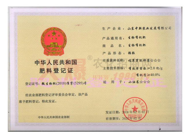 公司先后榮獲“綠色肥料生產(chǎn)基地骨干企業(yè)”、“全國守合同重信用企業(yè)”、“第十五屆山東省消費(fèi)者滿意單位”、“臨沂市市長質(zhì)量獎”等榮譽(yù)稱號!皢拘选毕盗形⑸锞时辉u為“2017年度中國十佳有機(jī)肥”。