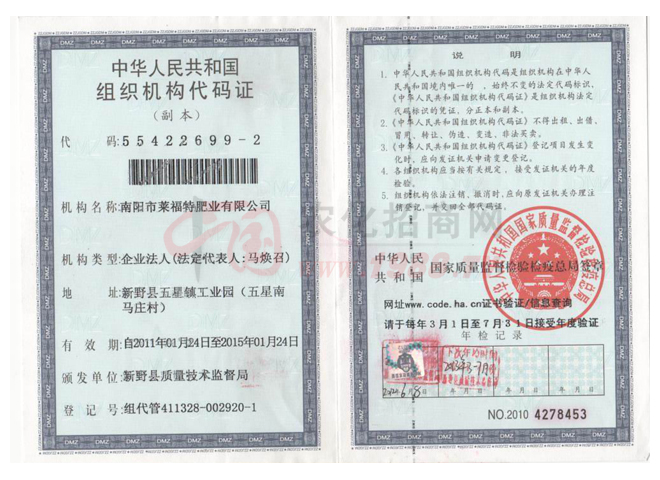 證書名稱:組織機構代碼證 發(fā)證機構:新野縣質量技術監(jiān)督局