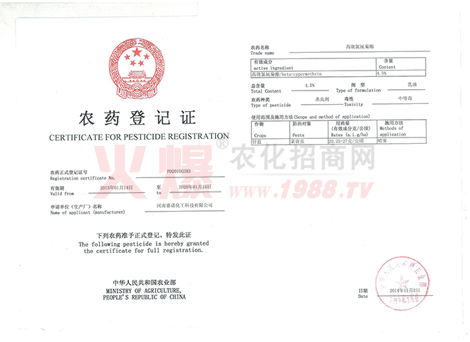 賽諾公司于2011年3月在國(guó)家農(nóng)業(yè)部進(jìn)行了豐之盼產(chǎn)品的登記申報(bào),并于2014年4月25日獲得了國(guó)家的正式農(nóng)藥登記,登記號(hào)為PD20141062。這是國(guó)內(nèi)第二家取得制劑正式登記的廠家。也是第二家把誘抗素商品化生產(chǎn)的廠家。