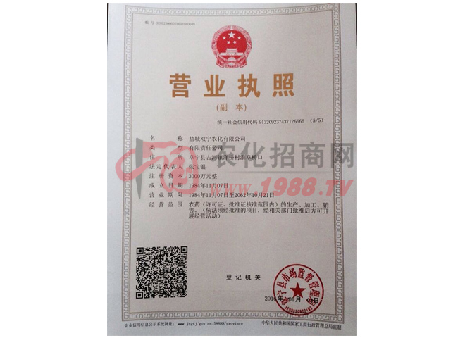 證書名稱:營業(yè)執(zhí)照 發(fā)證機(jī)構(gòu):阜寧縣市場監(jiān)督管理局