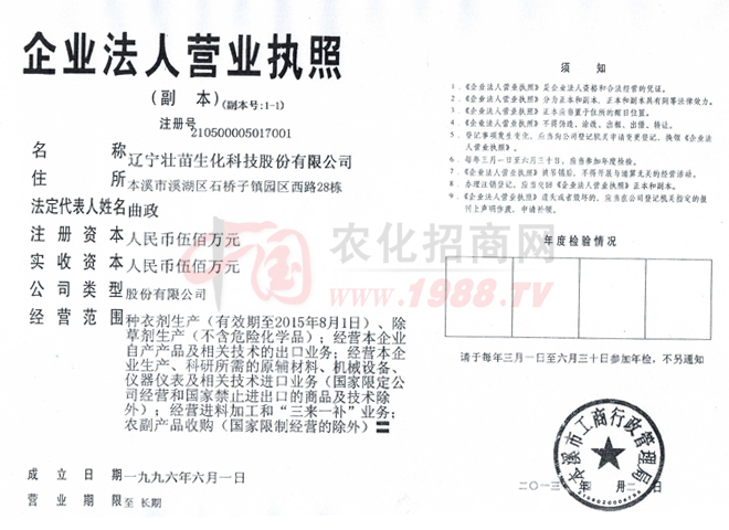 遼寧壯苗生化科技股份有限公司創(chuàng)建于1996年,位于遼寧省本溪經濟開發(fā)區(qū)濱河工業(yè)園區(qū),是國家發(fā)改委批準的定點農藥生產企業(yè),是以研發(fā)、生產、銷售系列種衣劑、特色除草劑等農化產品為主的高新技術企業(yè)。